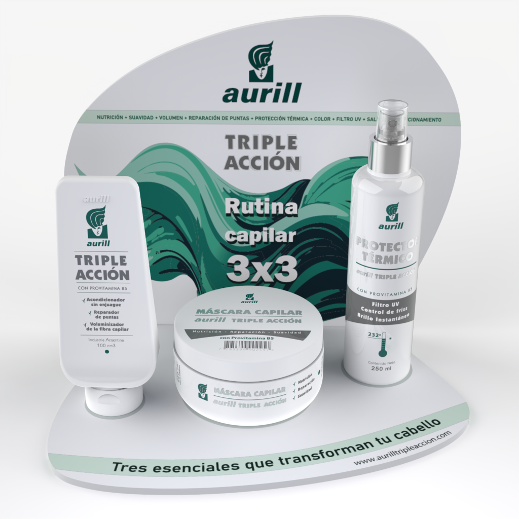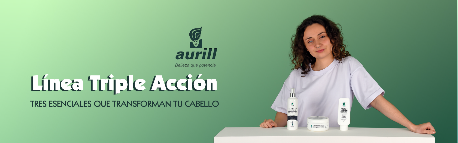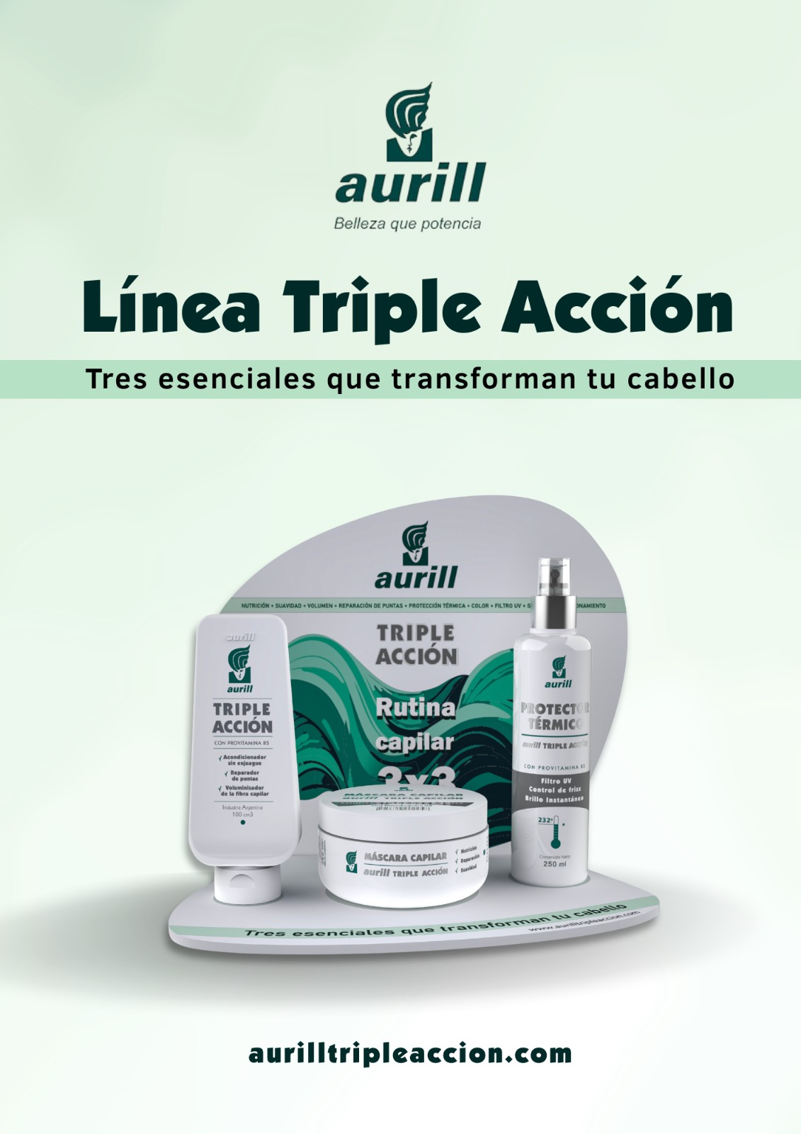 Aurill Triple Acción está aquí para potenciar tu cabello y tu estilo, con resultados profesionales en cada aplicación.